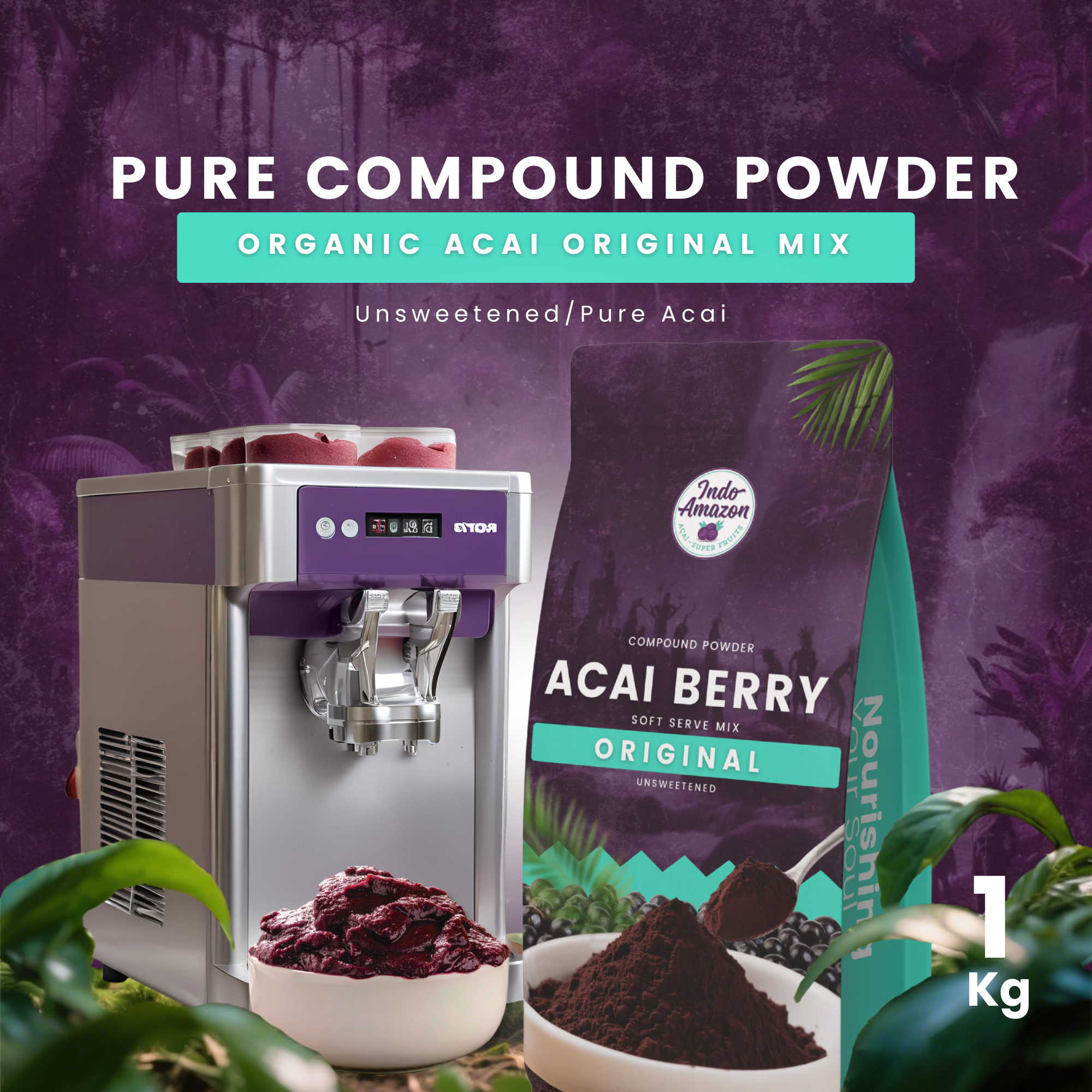Product obtained through the process of mixing organic açaí extract powder and other selected organic 100% natural ingredients. After hydration, a ready-to-use syrup for soft serve ice cream machines is created. 1 kg of this compound powder in addition of 3 litres of water produces 4.250 ml of frozen açai.